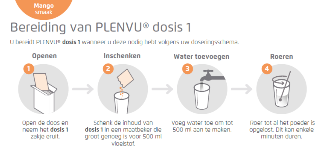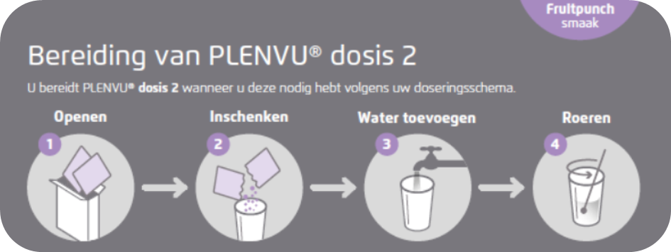 Dissolve the powder in half a litre of cool water. In addition, take half a litre of plain water (or tea). Drink it intermittently over the course of one hour to an hour and a half. Adhere to the timing and do not drink too quickly. Afterwards, you may drink plain water (or tea) until 2 hours before your admittance to hospital. You may still NOT drink alcohol, coffee or carbonated beverages.